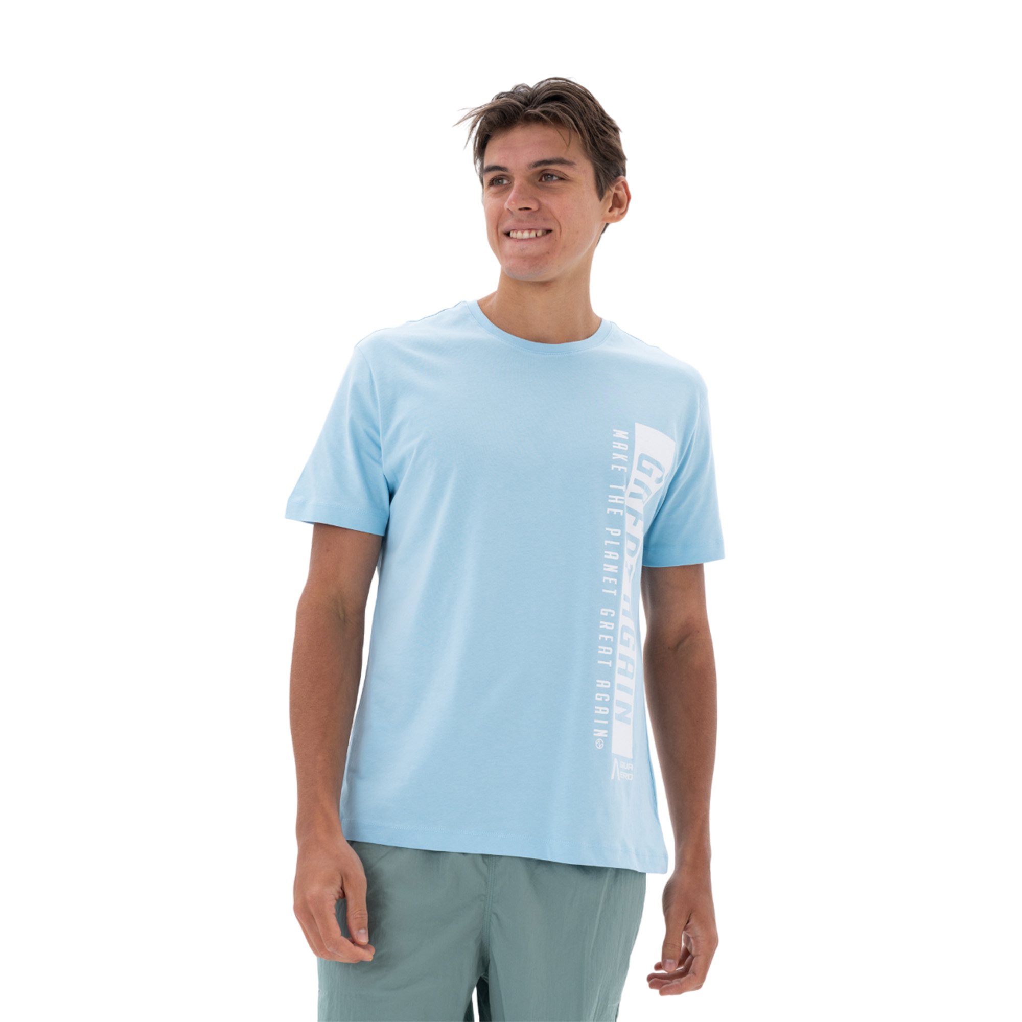 - Стильный голубой дизайн с крупной белой надписью сбоку
