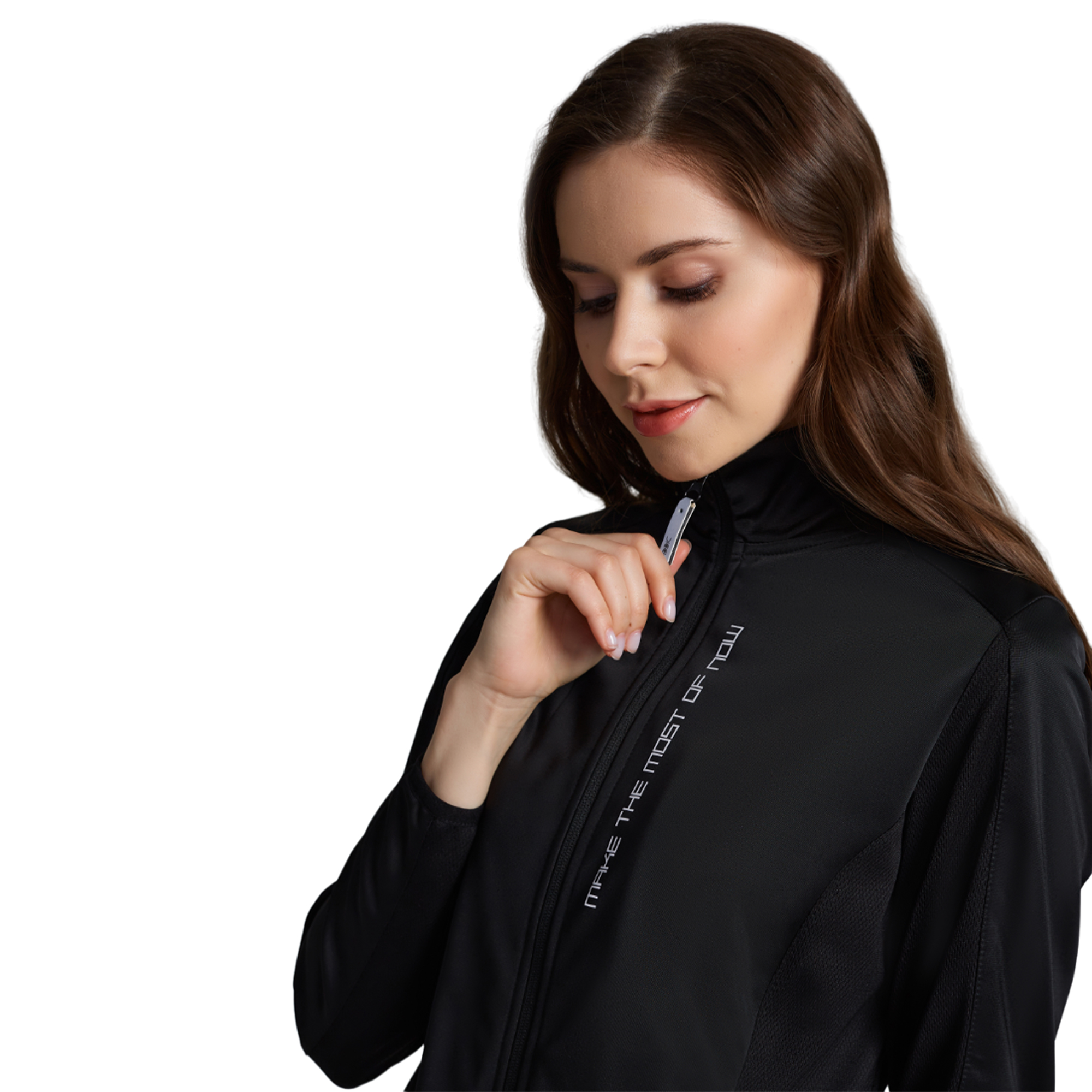 Спортивный костюм выполнен из полиэстровой ткани с изнаночным начесом. Куртка с воротником. На молниях используются навесные пуллеры с фирменным логотипом. Рукав втачной. Отрезные боковые детали полочек, рукавов и спинки выполнены из сетчтого полиэстра. Карманы куртки и брюк расположены в швах отрезных деталей с открытыми молниями. Брюки зауженные к низу. Низ куртки, низ рукавов обработаны эластичной тесьмой. По боковым сторонам брюк выполнен отрезной лампас из сетчатого полиэстра. На левой полочке и спинке выполнен термотрансфер "make the most of now". На левой половине брюк и на спинке нанесен термошеврон с фирменным логотипом.Особенности и характеристики: